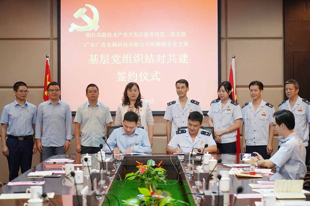 近日,广东广青金属科技有限公司职能联合党支部与阳江高新区税务局第二党支部在公司办公大楼举行了党组织结对共建签约仪式。公司党委副书记、纪委书记王大庆,阳江高新区税务局党委委员、副局长司徒钊等领导参加了签约仪式。