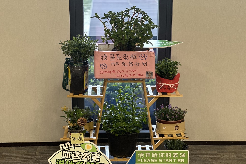 PRJ部门专属小花坊——“植愈小馆”,以工艺之名,赋予废弃品新生。在这里,食品包装盒、塑料瓶、泡沫箱等被赋予了新的生命,化作一个个再生花盆。钧宝的精美手工画装饰其上,犹如点睛之笔,为花盆增添了一抹文化韵味,每一盆都是对工艺与环保的完美融合。“植愈小馆”不仅是部门绿色文化的缩影,更是我们传递“变废为宝,循环再生”理念的生动实践。在这里,废弃不再是负担,而是创意与绿色的源泉,每一盆绿植都在诉说着“再生”的故事。